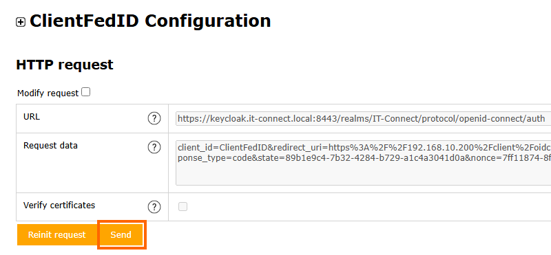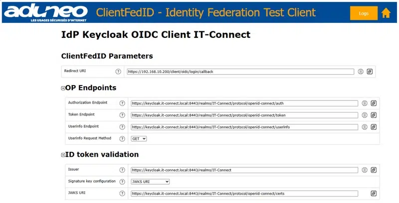 D'une part, nous disposons d'une instance Keycloak, et d'autre part, une instance de l'outil ClientFedID. Désormais, l'idée est la suivante : tester l'authentification OpenID Connect de Keycloak grâce à l'outil ClientFedID, ce dernier assurera donc le rôle de client d'un point de vue de Keycloak. L'intérêt étant de pouvoir analyser précisément les échanges entre les deux parties grâce aux données présentées dans l'interface de ClientFedID.