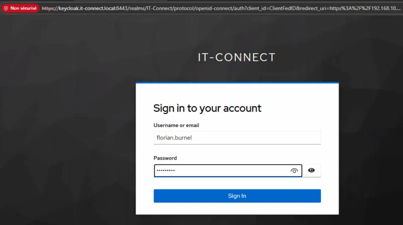 Vous serez alors redirigé vers la page de connexion de Keycloak ! C'est tout à fait logique : authentifiez-vous avec le compte utilisateur créé au tout début de la configuration.
