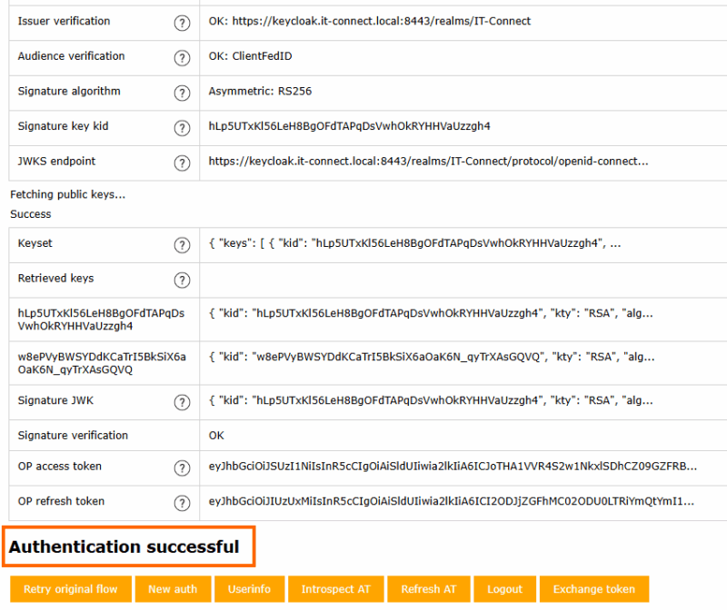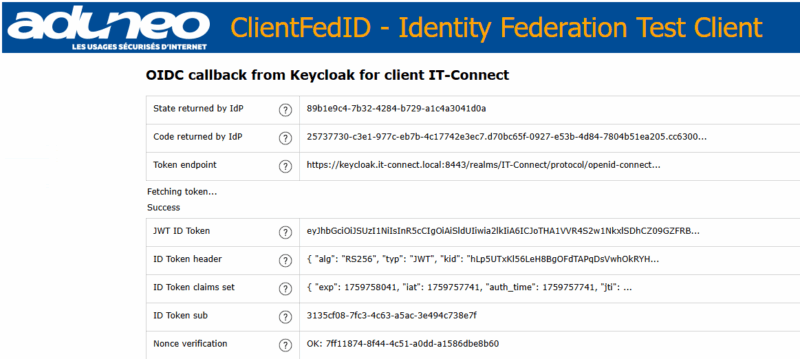 Surtout, et c'est tout l'intérêt de l'outil au-delà du test fonctionnel, c'est que vous avez tout le détail des échanges. En effet, l'outil affiche le résultat du flux d’authentification OpenID Connect entre Keycloak (en tant qu’Identity Provider) et ClientFedID (en tant que client de test). On peut notamment y voir la génération et la validation d’un Token JWT conforme aux spécifications OpenID Connect, ainsi que des précisions sur la signature du token qui utilise ici l’algorithme RS256 (RSA avec SHA-256).