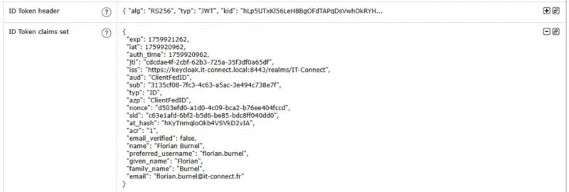 La capture d’écran ci-dessous illustre le contenu détaillé d’un jeton JWT émis par Keycloak et interprété par ClientFedID. On peut identifier des informations intéressantes :