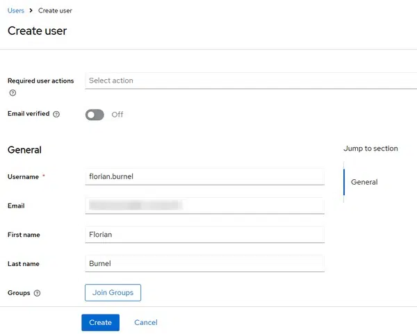 Au sein de ce nouveau realm, créez un nouvel utilisateur via la section "Users" disponible dans le menu latéral. Cet utilisateur de test sera utilisé par la suite pour simuler une connexion via ClientFedID.