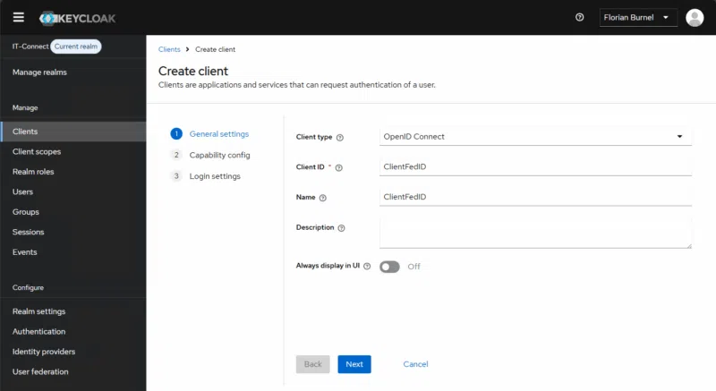Ici, nous évaluerons OIDC, donc choisissez OpenID Connect comme type de client. Donnez-lui un nom au sein du champ "Client ID", par exemple "ClientFedID". Cette valeur devra être réutilisée par la suite.