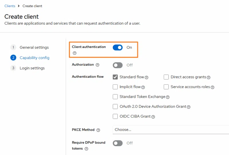 Dans la section "Capability config", activez l'authentification via l'option "Client authentication". Conservez les autres options par défaut.
