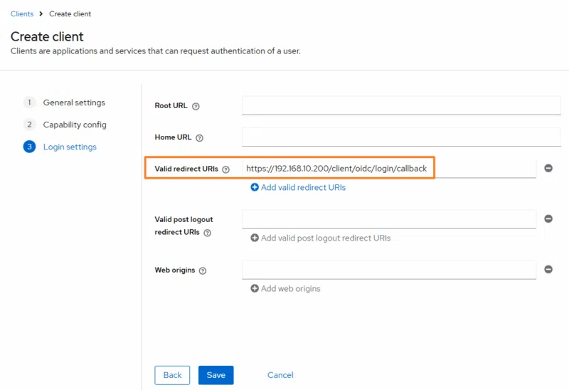 Basculez sur Keycloak et collez l'URL dans le champ "Valid redirect URIs".