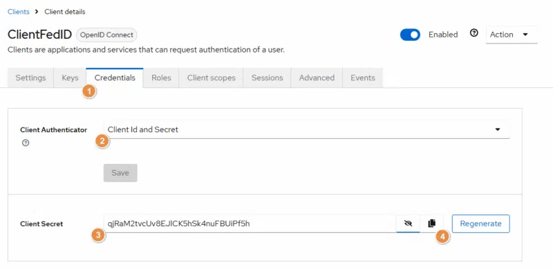 Cliquez sur "Save" pour valider la création du client. Ensuite, dans les propriétés de ce client, toujours dans Keycloak donc, cliquez sur l'onglet "Credentials" et copiez la valeur "Client Secret".