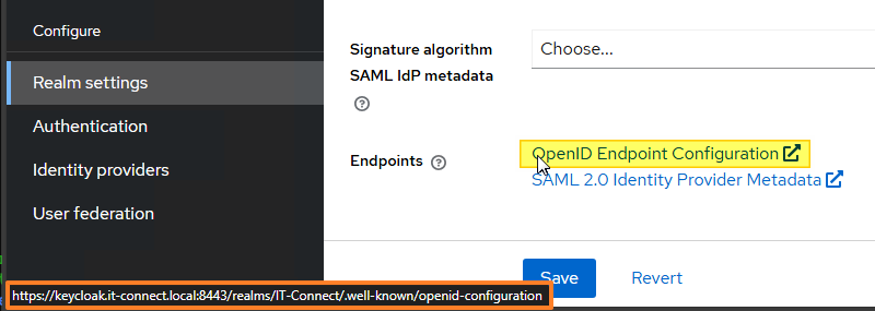 Quittez la gestion du client. Désormais, accédez à la section "Realm settings" située dans le bas du menu latéral. Positionnez votre souris sur le lien "OpenID Endpoint Configuration" pour copier l'URL correspondante (il n'est pas question de cliquer). Pour ma part, j'obtiens cette URL : https://keycloak.it-connect.local:8443/realms/IT-Connect/.well-known/openid-configuration.