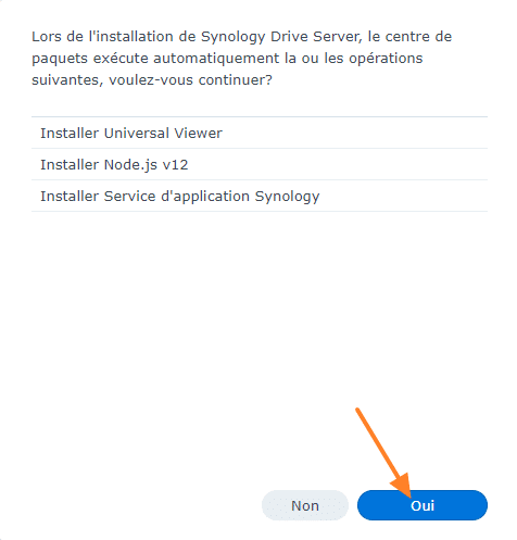 L'installation de ce paquet implique que d'autres paquets soient installés sur votre NAS : Universal Viewer, Node.js V12 et Service d'application Synology. Ce sont des dépendances qui sont obligatoires, donc validez avec "Oui".