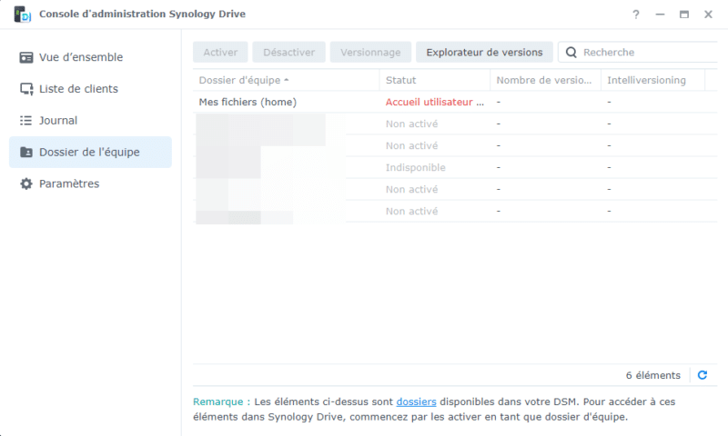 Accédez à la section "Dossier de l'équipe" qui permet d'activer Synology Drive sur un ou plusieurs partages de votre NAS ou sur les dossiers "home" des utilisateurs. En effet, ce sont les partages existants du NAS (ou que l'on crée pour l'occasion) qui peuvent être publiés par l'intermédiaire de Synology Drive.