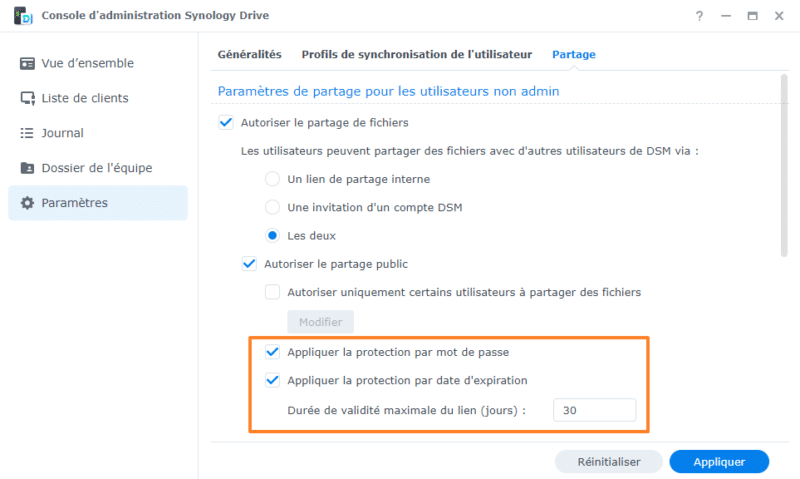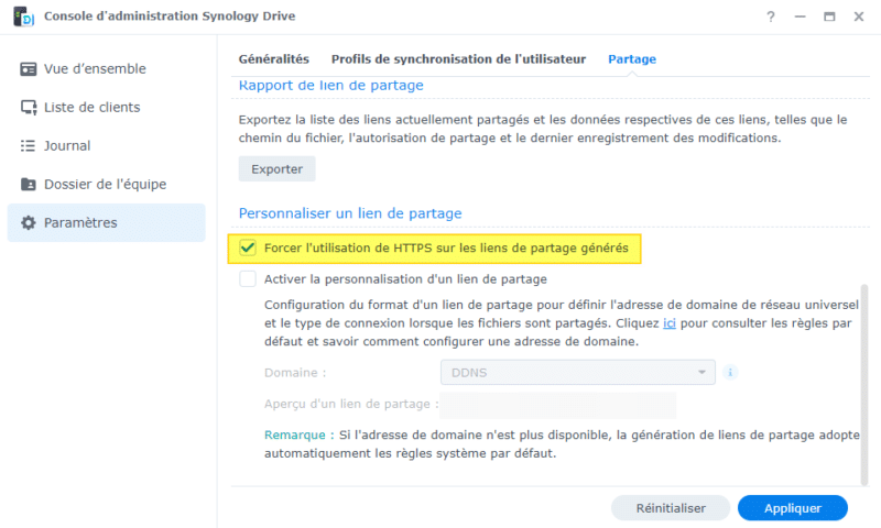 En complément, je vous recommande de cocher l'option "Forcer l'utilisation de HTTPS sur les liens de partage générés" pour utiliser uniquement des liens sécurisés pour partager les données.