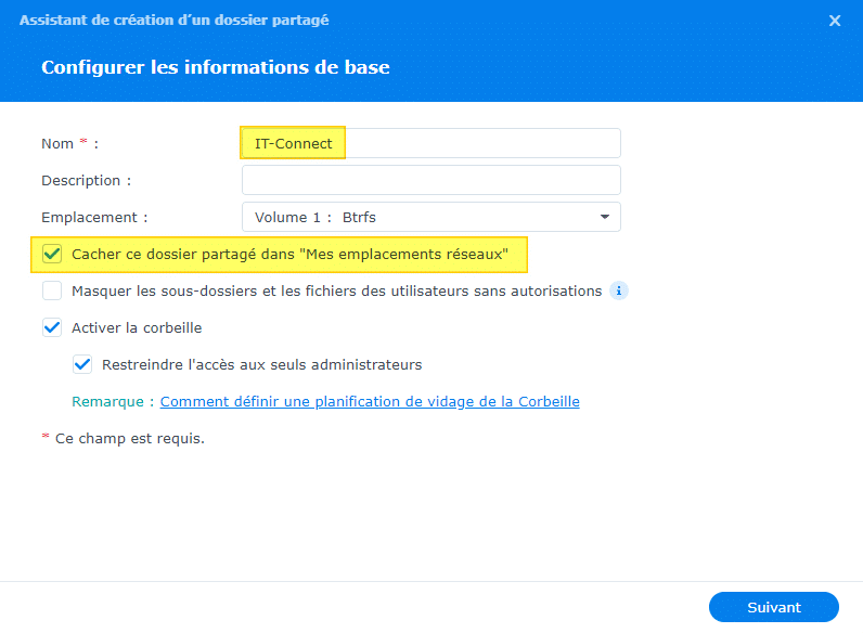 Nommez ce dossier, pour ma part "IT-Connect" et cochez l'option "Cacher ce dossier partagé dans Mes emplacements réseaux", car ce dossier n'a pas à être visible via la découverte réseau. Nous souhaitons l'utiliser au travers de Synology Drive. Poursuivez.