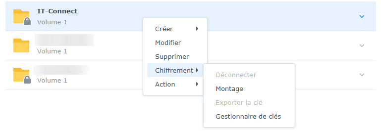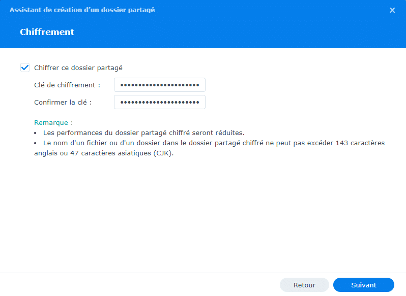 Ce n'est pas obligatoire, mais il est recommandé d'activer le chiffrement via l'option "Chiffrer ce dossier partagé". Définissez une clé de chiffrement robuste et stockez cette clé dans votre gestionnaire de mots de passe. Vous devez savoir que, en cas d'arrêt et redémarrage du NAS, il faudra se connecter à DSM afin de saisir la clé de chiffrement et monter le partage sur le NAS, et donc par extension dans Synology Drive.