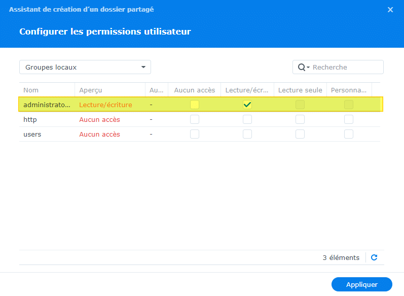 Ensuite, vous devez attribuer des autorisations sur ce dossier partagé. Vous pouvez le faire au niveau des utilisateurs, mais je vous recommande de travailler plutôt par groupe (vous pouvez créer un groupe ici : Panneau de configuration > Utilisateur et groupe > Groupe). Dans cet exemple, j'ajoute des autorisations sur le groupe "Administrators" pour que les membres de ce groupe puissent lire et écrire dans ce dossier partagé, et à terme, l'utiliser via Synology Drive.