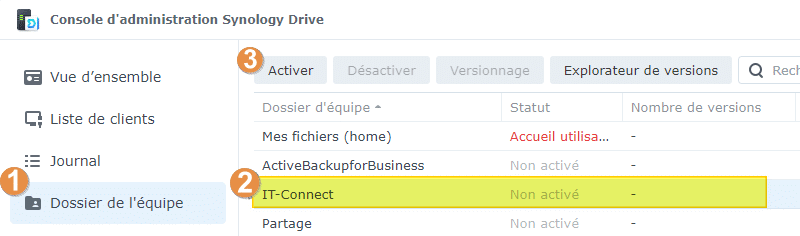 Désormais, retournez dans la Console d'administration Synology Drive afin d'activer ce dossier d'équipe. Cliquez sur "Dossier de l'équipe" (1), sélectionnez le dossier "IT-Connect" (2) et cliquez sur "Activer" (3).