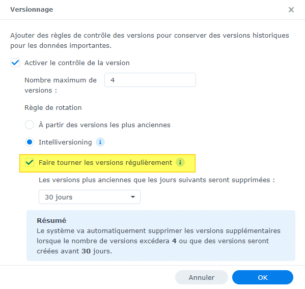 Une fenêtre de configuration s'ouvre. Vous pouvez gérer plusieurs versions de fichiers, ce qui permet de revenir facilement en arrière en cas de mauvaise manipulation. En complément, vous pouvez supprimer les anciennes versions régulièrement (bien sûr, cela ne supprime pas le fichier) en cochant l'option "Faire tourner les versions régulièrement".