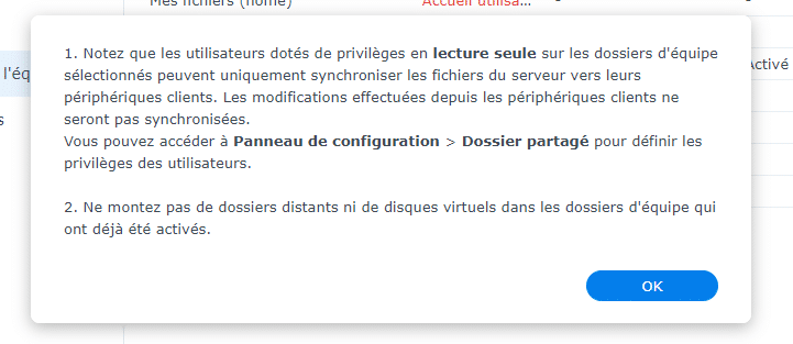 Note : le dossier d'accueil utilisateur (home) doit être activé au niveau de DSM afin de pouvoir être activé au niveau de Synology Drive.