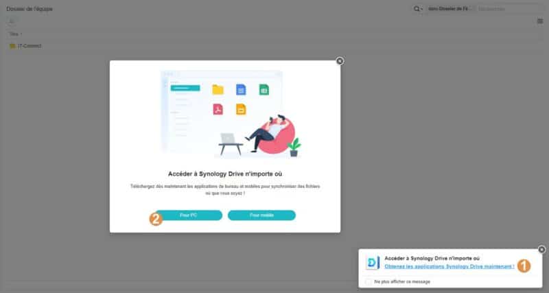 L'interface Web de Synology Drive va s'ouvrir, ce qui permet d'accéder à ses données en mode Web sans avoir à installer le client Synology Drive. Néanmoins, au quotidien sur son PC, ce sera beaucoup plus pratique d'avoir le client. Sur la fenêtre qui s'affiche, cliquez sur "Obtenir les applications Synology Drive maintenant" (1) puis sur "Pour PC". Le téléchargement va débuter.