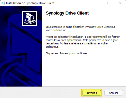 Une fois le téléchargement terminé, démarrez l'installation de Synology Drive Client : quelques clics suffisent.