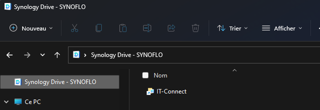 Du côté de l'Explorateur de fichiers Windows, vous pouvez retrouver une nouvelle entrée nommée "Synology Drive - SYNOFLO" (avec le nom de votre NAS) qui donne un accès direct au contenu du Drive. Si un fichier est déposé dans le répertoire "IT-Connect", il sera synchronisé sur le NAS, et donc sur le NAS, il sera visible dans le dossier "IT-Connect" également. Il sera visible aussi par les autres utilisateurs qui ont un accès au dossier "IT-Connect".