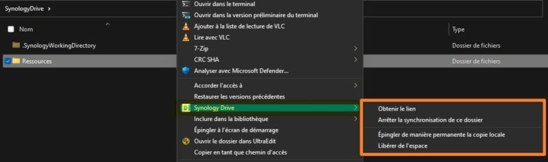 Lorsque vous effectuez un clic droit sur un élément du Drive, vous pouvez voir l'entrée "Synology Drive" dans le menu contextuel. Cela donne accès à des fonctions liées à la synchronisation à la demande. Si vous souhaitez qu'un fichier ou un dossier soit toujours disponible sur votre PC, même en mode hors ligne (sans connexion au NAS), vous devez choisir l'option "Épingler de manière permanente une copie locale".