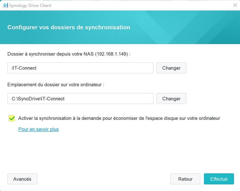 Note : il faut savoir qu'il ne peut y avoir qu'un seul répertoire "SynologyDrive" donc si vous décidez de synchroniser un autre dossier, il faudra utiliser un autre nom.