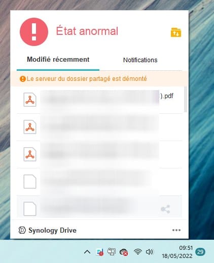 Le client Synology Drive peut afficher le statut "État anormal", ce qui peut s'expliquer par une perte de connexion avec le NAS Synology, mais s'il y a le message "Le serveur du dossier partagé est démonté" qui s'affiche, alors le problème est ailleurs.