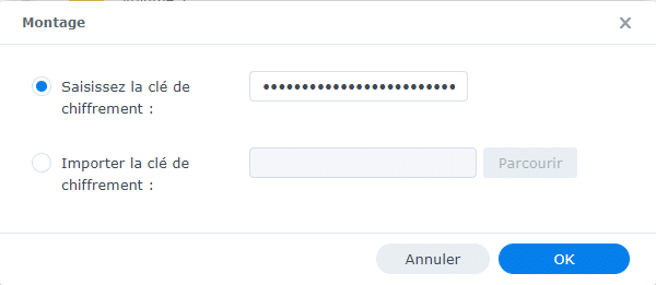 Il sera nécessaire de saisir la clé de chiffrement et de cliquer sur "OK" pour monter le répertoire et rétablir le bon fonctionnement du client Synology Drive. Souvenez-vous de la clé de chiffrement saisie lors de la création du partage.