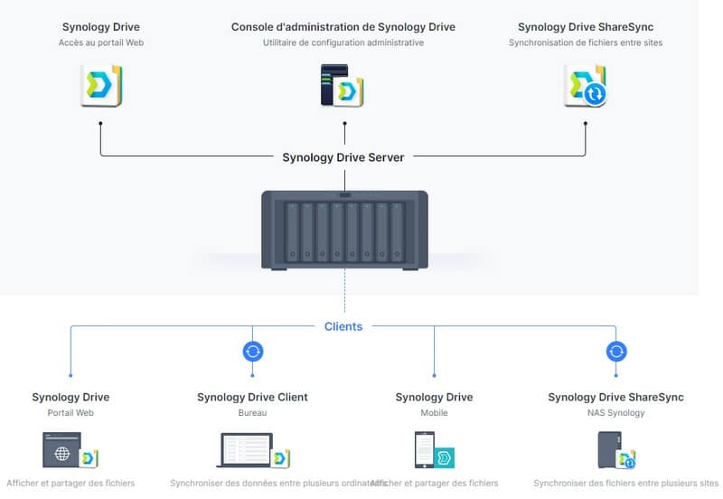 Dans ce tutoriel, nous allons voir comment mettre en place la solution Synology Drive Server sur un NAS Synology afin de stocker, partager et synchroniser des fichiers facilement. Cette solution reprend le principe de Google Drive, Dropbox, OneDrive, etc... Où les données sont stockées sur un espace de stockage centralisé et accessible à partir de périphériques (ordinateurs, smartphones, tablettes) à partir d'un navigateur ou d'un client de synchronisation. Sauf que là, la différence n'est pas négligeable : les données sont hébergées sur votre NAS, et non dans le Cloud public, comme on peut le faire avec d'autres solutions (Nextcloud) ou NAS dans le but de créer son Cloud privé.