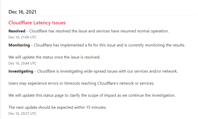 Si l'on regarde la page de statut de CloudFlare, on peut voir que l'incident a duré environ 45 minutes, entre le moment où il a été détecté et résolu. D'ailleurs, les équipes de CloudFlare ont également résolu un autre incident qui touche le système de cache au sein du CDN CloudFlare.