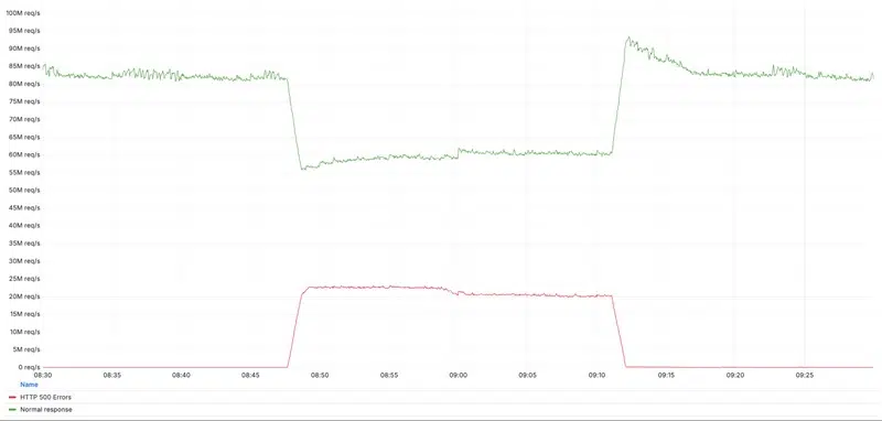 L'impact est également inférieur. Comme le montre le graphique ci-dessous, il y a eu un pic d'erreurs HTTP (code 500), ce qui a perturbé une partie du trafic global de façon temporaire (ligne verte). C'est moins significatif que lors de la précédente panne historique.