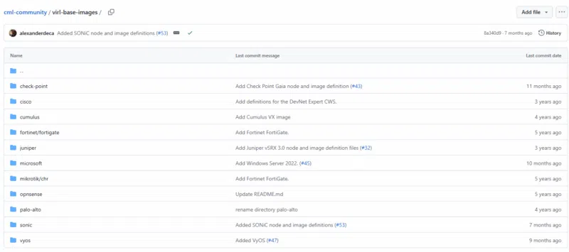 Sur le GitHub de CiscoDevNet, il existe un dépôt cml-community qui contient les images de définitions pour chaque éditeur.
