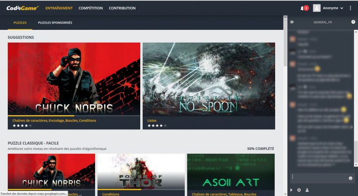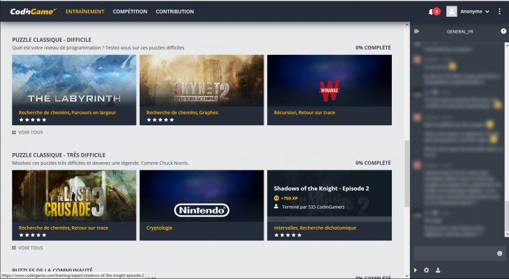 Je vous ai récemment parlé de CodeCombat, plutôt dédié à un public jeune, qui permet d'apprendre le code de façon amusante au travers la manipulation d'un héro qui doit réaliser certaines tâches. CodinGame est un site web qui poursuit le même but : apprendre le développement et le code au travers l'amusement, et plus précisément au travers des exercices et challenges. La gamification est largement présente, comme dans de plus en plus de plateforme en tout genre.