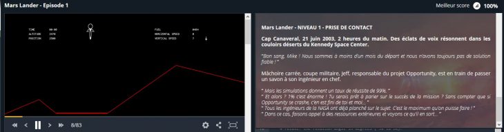 Également, chaque exercice dispose d'une animation propre qui permet de mettre en scène les actions de notre code, ce qui met encore plus en avant l'aspect ludique et éloigne l'ennui de la seule vue de l'éditeur texte permettant de développer. Également, un synopsis permet d'apporter une histoire à l'exercice. Voici quelques exemples :