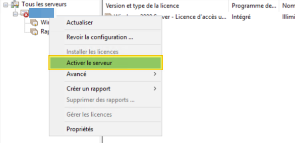 La première étape consiste à activer le serveur RDS en lui-même. Pour cela, ouvrez le gestionnaire de licences des services Bureau à distance. Effectuez un clic droit sur votre serveur de licence RDS et cliquez sur "Activer le serveur".