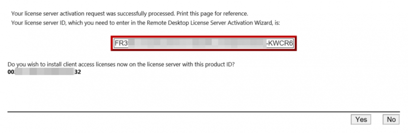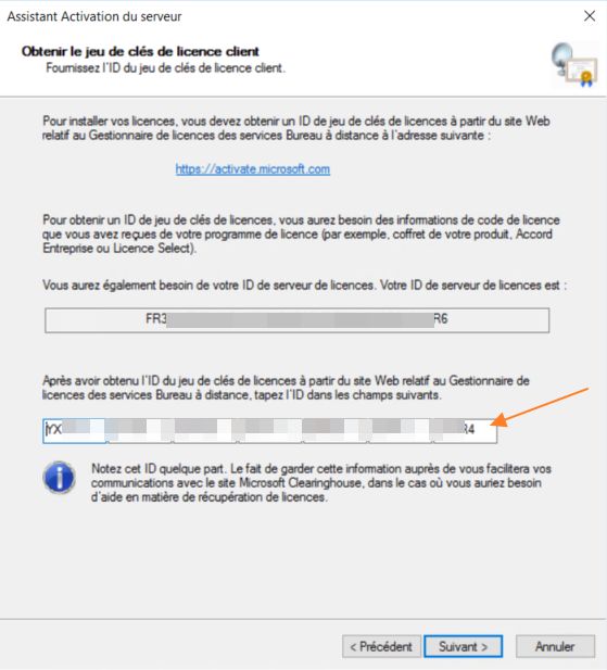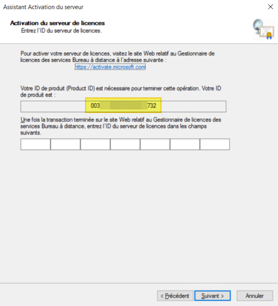 Vous devrez saisir votre product ID, qui s'affiche sur le serveur RDS, avant de poursuivre. Ensuite, votre requête devrait aboutir et Microsoft va afficher une licence pour votre serveur. Il suffit de la recopier dans l'assistant.