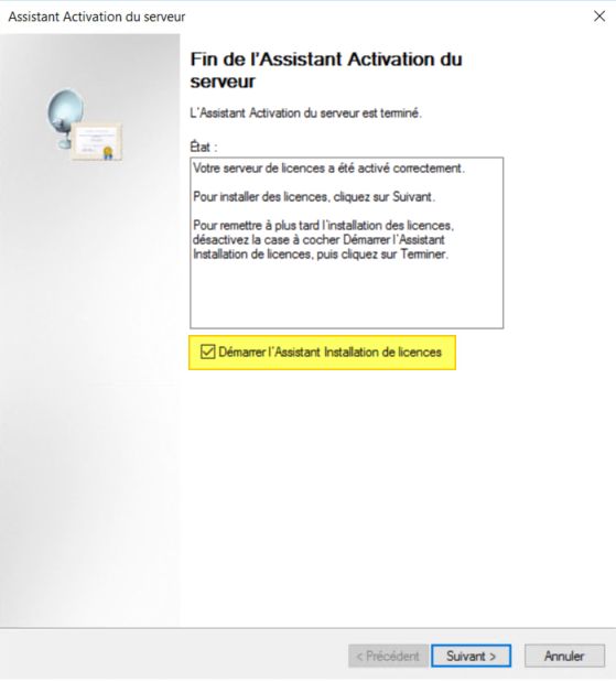 Suite à ça, votre serveur est activé ! 🙂 Au moment de quitter l'assistant, pensez à cliquer sur "Démarrer l'Assistant installation de licences" pour que l'on puisse ajouter vos CALs RDS.