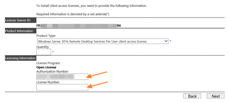 En fonction du type de licence sélectionné, les informations demandées peuvent être différentes. Dans le cadre d'une licence Open, il faut indiquer le numéro d'autorisation et le numéro de licence. Il faudra penser à sélectionner également le bon produit et indiquer la quantité correspondante à ce que vous avez acheté.