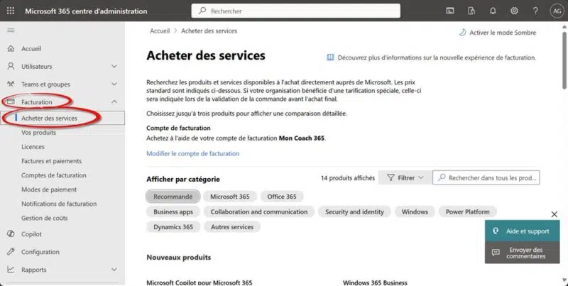 Dans le Centre d’administration Microsoft 365, il faut développer « Facturation » puis accéder à « Acheter des services ».