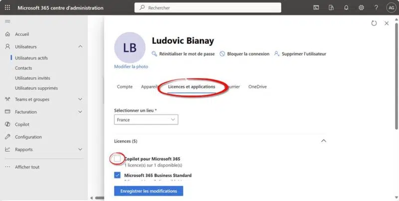 Ensuite, dans l’onglet « Licences et applications », sélectionnez « Copilot pour Microsoft 365 » puis cliquez sur « Enregistrer les modifications ».