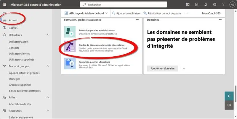 Pour guider vos utilisateurs à l’utilisation de Copilot pour Microsoft 365, vous devez utiliser Configurer Microsoft 365 Copilot. Vous pourrez ainsi envoyer un message d’information à vos utilisateurs. Pour accéder à cette fonctionnalité, cliquez sur « Accueil » puis sur « Guides de déploiement avancés et assistance ».