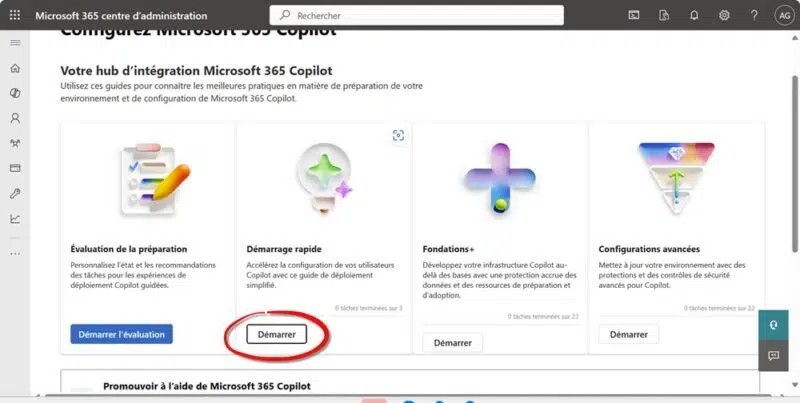 Il faut ensuite cliquer sur « Configurer Microsoft 365 Copilot », puis sur le bouton sous « Démarrage rapide ».