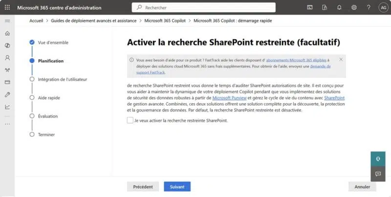 La première étape est la « Vue d’ensemble » qui vous explique les grandes lignes de l’utilisation de Copilot pour Microsoft 365. En cliquant sur « Suivant », le volet « Activer la recherche SharePoint restreinte (facultatif) » apparaît. Cette fonctionnalité est utile si vous souhaitez auditer les autorisations de sites SharePoint. Cliquez sur « Suivant » pour passer à l’étape suivante.