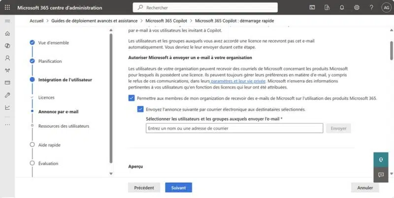 La prochaine étape vous permet d’attribuer une licence Copilot à d’autres utilisateurs. Cliquez sur « Suivant » après avoir attribué une licence à un utilisateur si ce n’est pas fait. L’étape suivante vous permet d’envoyer un e-mail d’information à vos utilisateurs ayant une licence Copilot. Dans le formulaire « Sélectionner les utilisateurs et les groupes auxquels envoyer l’e-mail », inscrivez l’adresse e-mail ou les groupes utilisateurs avec licence Copilot. Il peut aussi être utile de laisser coché « Permettre aux membres de mon organisation de recevoir des e-mails de Microsoft sur l’utilisation des produits Microsoft 365 ». Cela permettra à vos utilisateurs d’être informés des nouveautés de Copilot ainsi que des astuces d’utilisation.