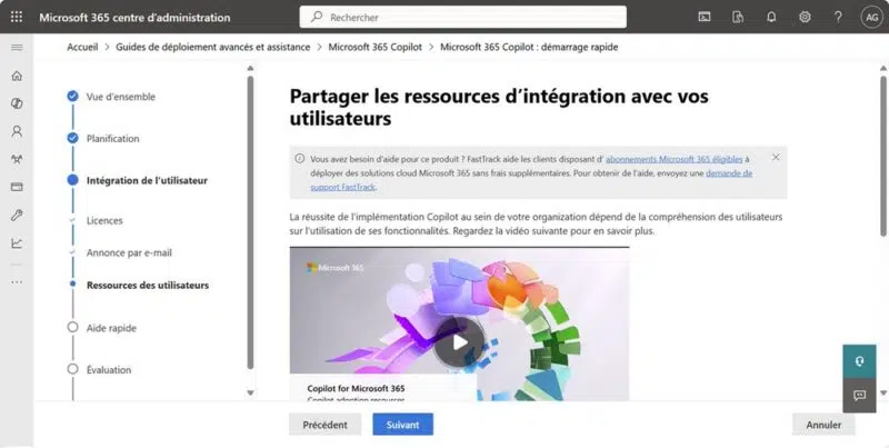 L’étape suivante vous permet d’obtenir des ressources supplémentaires pour aider vos utilisateurs à tirer pleinement parti de Microsoft 365. Cliquez sur « Suivant » pour accéder à l’aide rapide.
