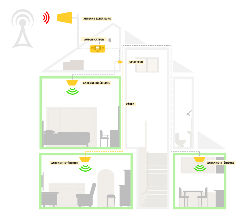 - Amplificateur GSM : composé de trois éléments (antenne extérieure, antenne intérieure et répéteur), il va capter le signal grâce à son antenne puissance et ensuite répéter le signal au sein de votre logement. Cette solution est plus efficace mais plus contraignante à mettre en oeuvre.