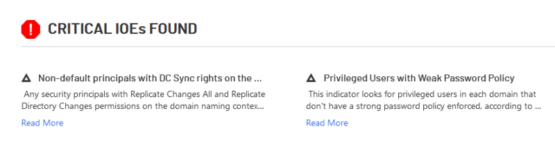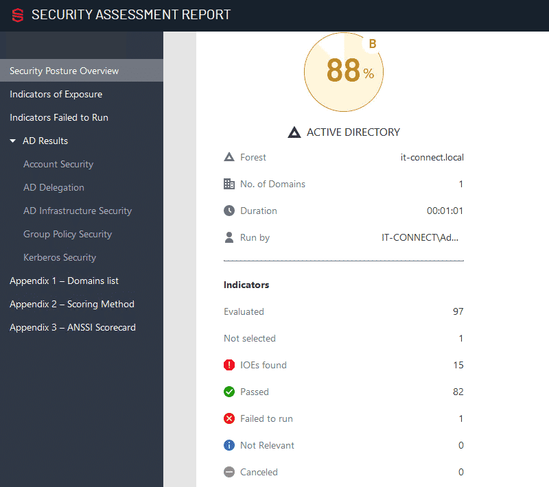 Ce qui m'intéresse dans un premier temps, c'est le résultat pour la ligne "IOEs found", 15 dans mon cas. En fait, IOE signifie Indicators of Exposure (Indicateurs d'exposition) et cela correspond au nombre de règles pour lesquelles mon Active Directory n'est pas conforme aux recommandations.
