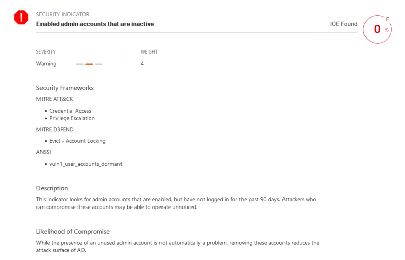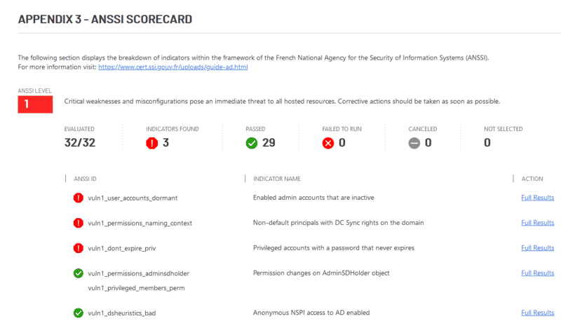 Ce qui est plaisant avec Purple Knight, c'est qu'il fait le lien entre les points vérifiés et les recommandations du MITRE et de l'ANSSI. Du coup, si l'on prend l'exemple de l'ANSSI, chaque élément vérifié à un "ANSSI ID", par exemple "vuln1_user_accounts_dormant", que l'on peut retrouver dans le guide "Point de contrôle de l'Active Directory" de l'ANSSI disponible ici. C'est très pratique, car Purple Knight permet de voir rapidement si notre Active Directory respecte les recommandations de l'ANSSI.