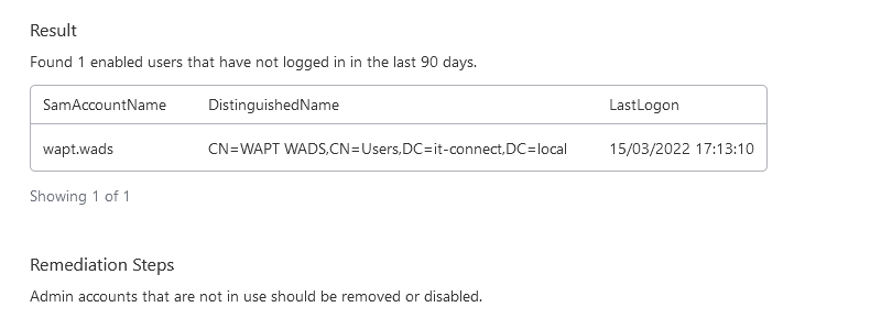 La règle ci-dessous m'indique que j'ai un compte administrateur sur mon Active Directory qui est actif (utilisable, disons), mais qui n'a pas été utilisé depuis longtemps.