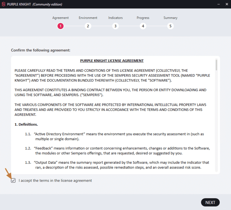 Pour lancer un audit avec Purple Knight, c'est tout simple : il faut exécuter le fichier "PurpleKnight.exe". Un assistant s'ouvre. Commençons par accepter les conditions d'utilisation avant de poursuivre.
