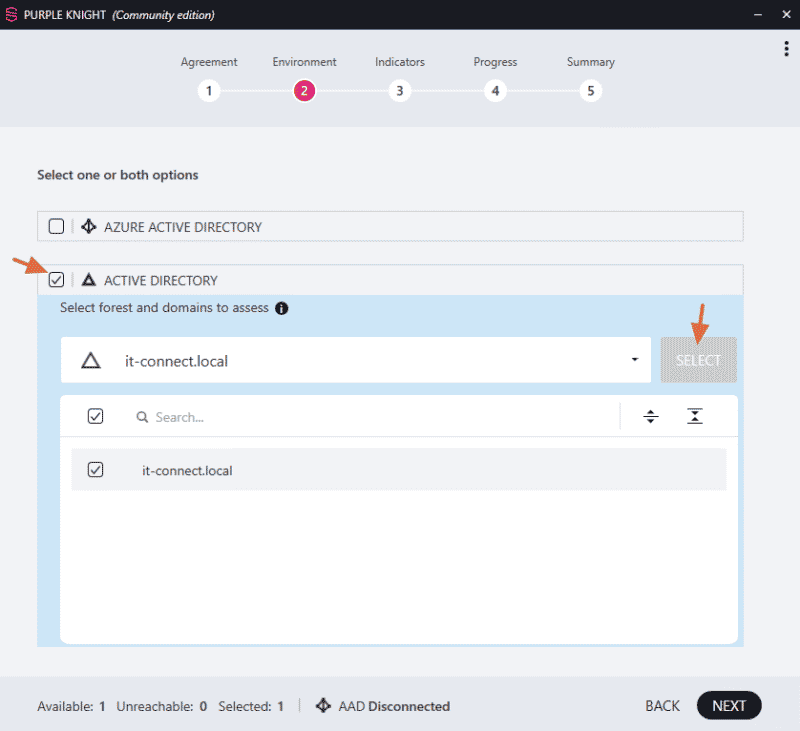 La seconde étape consiste à sélectionner l'environnement cible, à auditer donc. Ici, c'est l'Active Directory du domaine "it-connect.local" qui va nous intéresser, donc il faut cocher la case à côté de "Active Directory" puis cliquer sur le bouton "Select" pour sélectionner le domaine. On peut sélectionner plusieurs domaines. Quand c'est fait, on peut cliquer sur "Next".