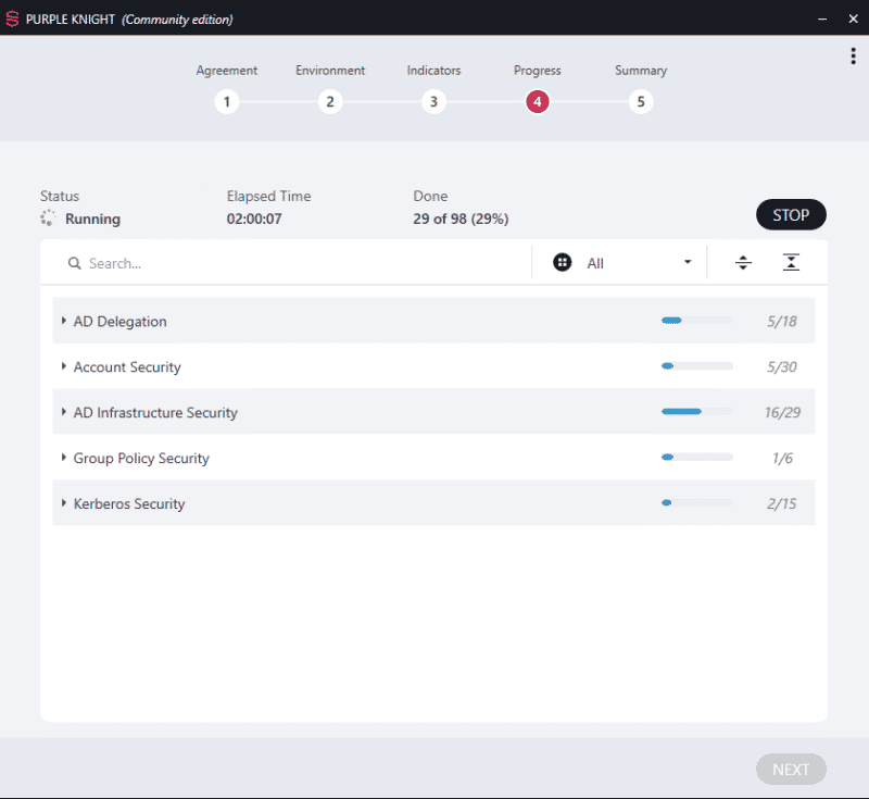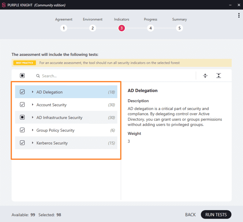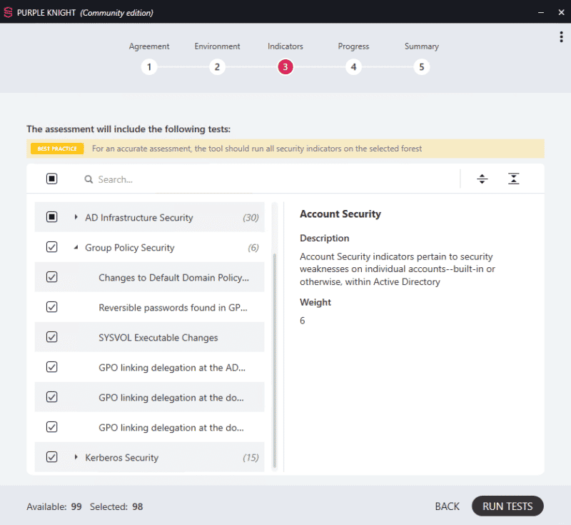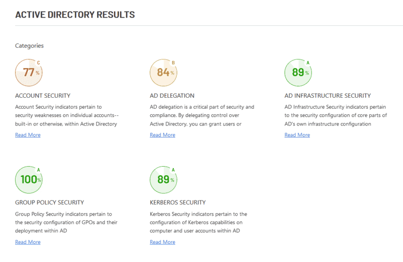 Environ 100 points liés à la sécurité de l'Active Directory sont vérifiés par Purple Knight, aussi bien sur la sécurité des comptes, la délégation Active Directory, les stratégies de groupe, l'infrastructure Active Directory en elle-même, que les options liées à Kerberos.